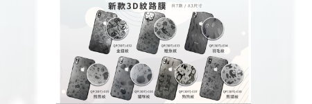 -Qplus- 新增3D紋路膜(A3 Size) QP(3DT-032)~(3DT-038) 新圖案、圖像清晰、不脫落 -使用Viewcal (Lintec灰)膜製程 -手機(殻)/筆電/平板包膜專用膜 -不縮膜/不殘膠/易定型/抗刮 -歡迎包膜門市選購 ◎選圖請參考官網 -www.qplus.com.tw ◎線...